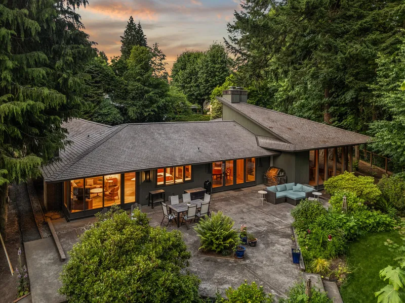 Nestled among old growth trees, this 1.4-acre mid-century modern masterpiece is truly one of a kind. Designed by renowned PNW Architect George Suyama, the home effortlessly blends his iconic early designs with modern touches. The dramatic living room features soaring 24-foot ceilings with cedar paneling. An updated kitchen with quartz countertops, ribbon mahogany cabinets & newer appliances seamlessly flow into a cozy family room. The formal dining room & bonus room are ideal for entertaining. Brand new carpet & newly refinished hardwoods grace this home. 3 fireplaces. Spacious primary with en suite. Every room invites the beauty of the PNW indoors. A rare opportunity to own a true architectural gem in the heart of Olympia.