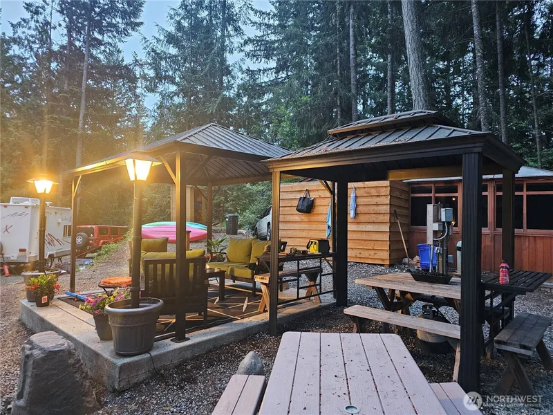 WATERFRONT parcel with direct access to Blue Lake inside the Clearwood Community. Beautifully landscaped w/retaining walls & a concrete block firepit. A 12' x 16' outbuilding will house your toys Your own private covered hot tub & infrared sauna can be enjoyed year 'round or cozy up under the gazebo for the most serene views of Blue Lake and the tall firs. Power & water are on the property as well as 30 amp hook up for RV up to 24". With 120' of low bank lake access, this lot is perfect for kayaking, paddle boarding or paddle boat! 14 miles of walking trails takes you around Blue Lake & Clear Lake. Explore the any of the 6 swimming beaches, parks, pickleball courts, or swimming pool/hot tub! Convenient camp bathrooms on cul de sac.