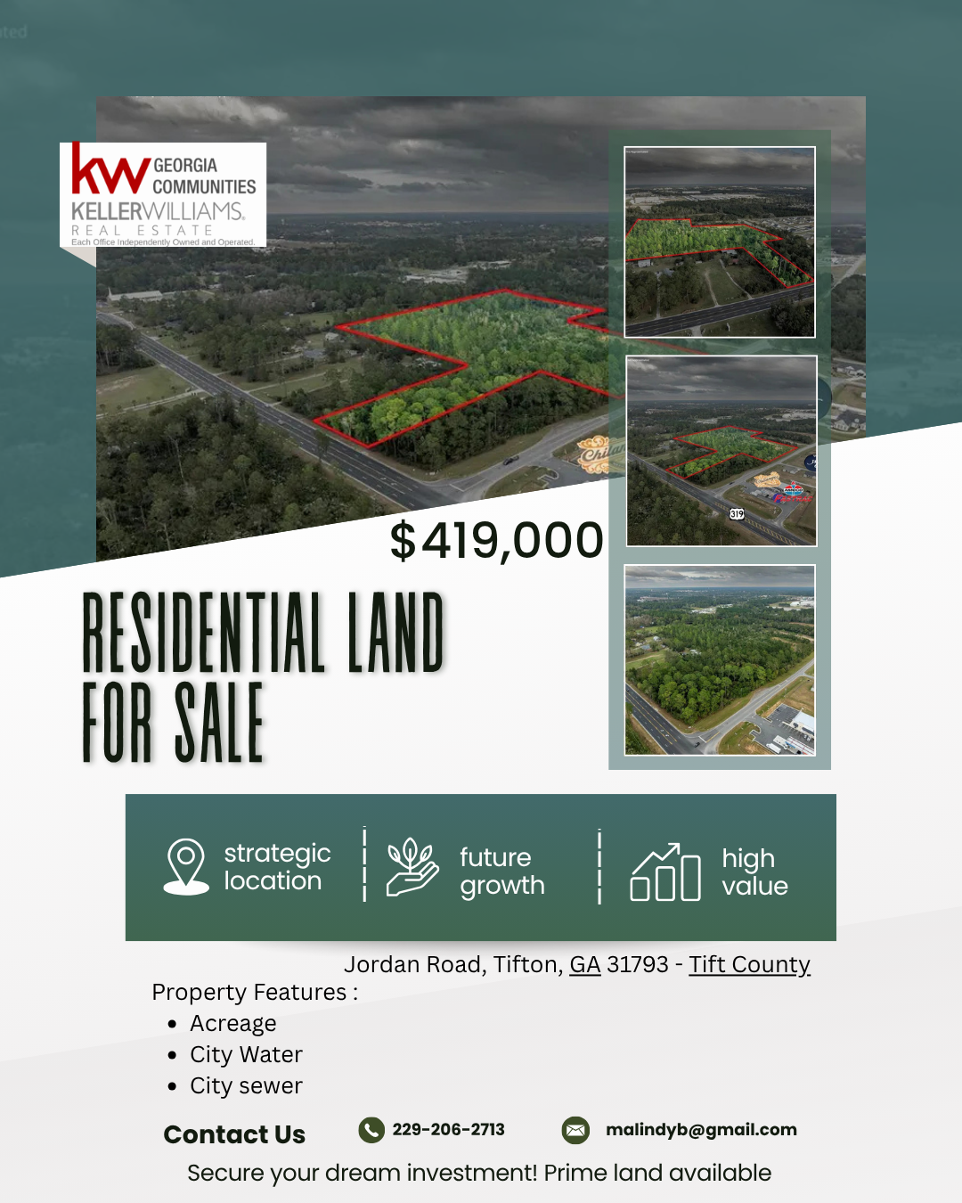 Excellent site for residential development in one of Tift County's most rapidly developing areas! Located on the south west side of town, directly across from the entrance of The Cove at Willow Creek subdivision. This property has access from HWY 319 S and Jordan Rd. Zoned AG which accommodates single family residential, mobile homes, personal care homes, schools, and AG related businesses. County water and overheard/underground utilities available.