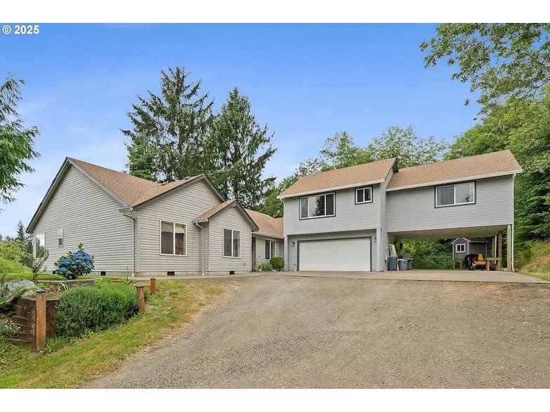 Escape to your private country retreat on 2+ acres with sweeping views of surrounding mountains & forest. Custom-built five-bedroom home is tucked in a quiet neighborhood & showcases quality craftsmanship throughout hardwood floors & cabinets, granite counters, stunning Montana River Rock fireplace, & newer composite decking. Open-concept kitchen & living area, perfect for entertaining, while beautifully landscaped grounds, hot tub & second level guest quarters offer comfort & versatility. Well appointed home office! Two car finished garage, w/storage space & carport allow for extra parking. Must see for the family that wants room for kids to run! Don't miss fruit trees, tree house & chicken coop, & just 10 miles from Pacific Ocean beaches! Rare blend of space, privacy & mountain charm!
