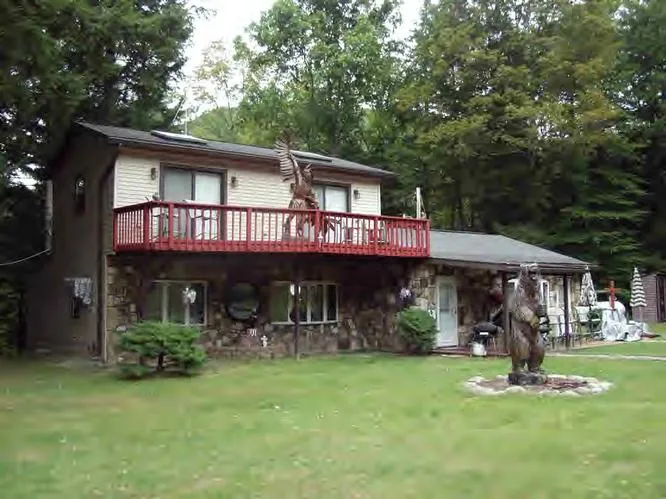 Chance to own a piece of heaven known as Mongoose Meadows. 2 story home with 3 BRs, full bath and two 1/2 baths. Large eat-in kitchen, deck off the 2nd floor. Attractive finished pavilion with bar and dining area for optimal entertaining; unique landscaping, including a pond - all on almost 2 acres close to State Land.