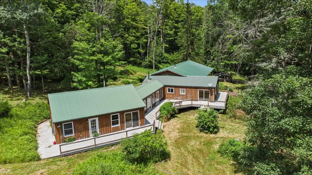 Discover your own private hideaway in this unique 2 bedroom, 3 full bath home nestled amidst 112+ acres of mostly wooded surroundings, offering breathtaking views from every angle. Both bedrooms features its own ensuite bathroom, providing ultimate comfort and privacy. Additionally, there's a versatile room that can serve as a potential 3rd bedroom, office, or sunroom with convenient outdoor access. Uniquely designed kitchen with ample natural light! Spacious 15x24 family/dining room with a cozy wood stove, perfect for enjoying time with the family or entertaining guests. Large 22x23 library or additional living space with so much potential to be anything you want! Outside you'll find a wrap around deck offering panoramic views, 2 horse barns, a small pond and stream! Windmill lease will convey with the property. Current residual timber value estimate coming soon! Don't let this rare find pass you up, call today to schedule your private tour of this one of a kind home!