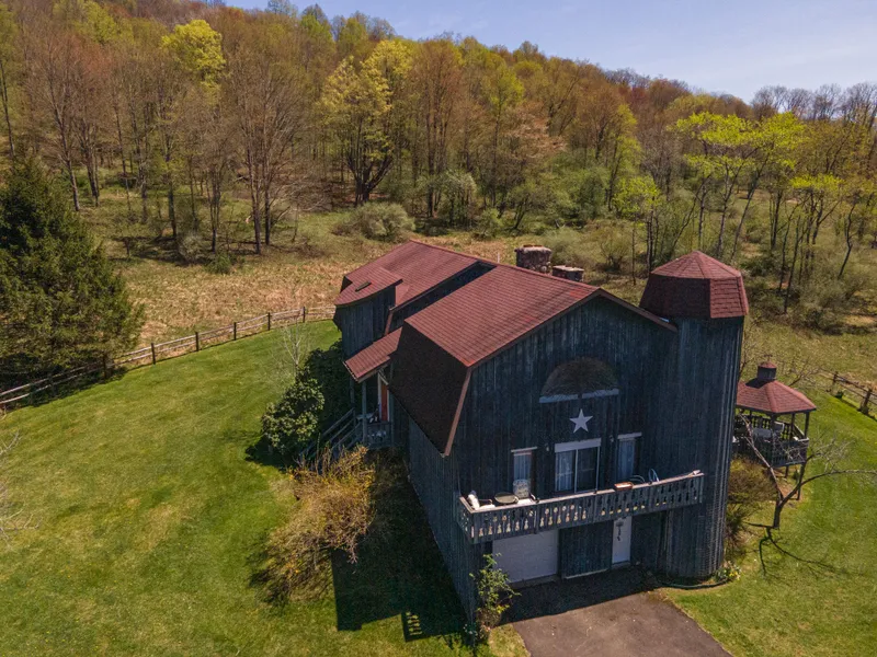 This rare property includes a large lodge in remote Tioga County bordering Pa State Game Lands. The 2 story lodge/house has 5,043 sq. ft. of living quarters plus a full basement with 5 bedrooms,3 bathrooms along with a master suite with fireplace and hot tub, a library and game room. This interior of home has a hand made spiral oak staircase, fireplace built with 2 thick stone dug from property, entry way floor is brick all from a historic movie theater in downtown Galeton that burned down, ceiling is 6 thick tongue and groove hardwood, peak of living room has stained glass window representing the four seasons. Kitchen includes commercial Vulcan oven, sunk in seating area and antique wood fired oven in mint condition connected to a brick warming oven in dining room. The exterior of home is rough cut lumber with 2 silos one on each side serving as staircase to each floor of home. The home...