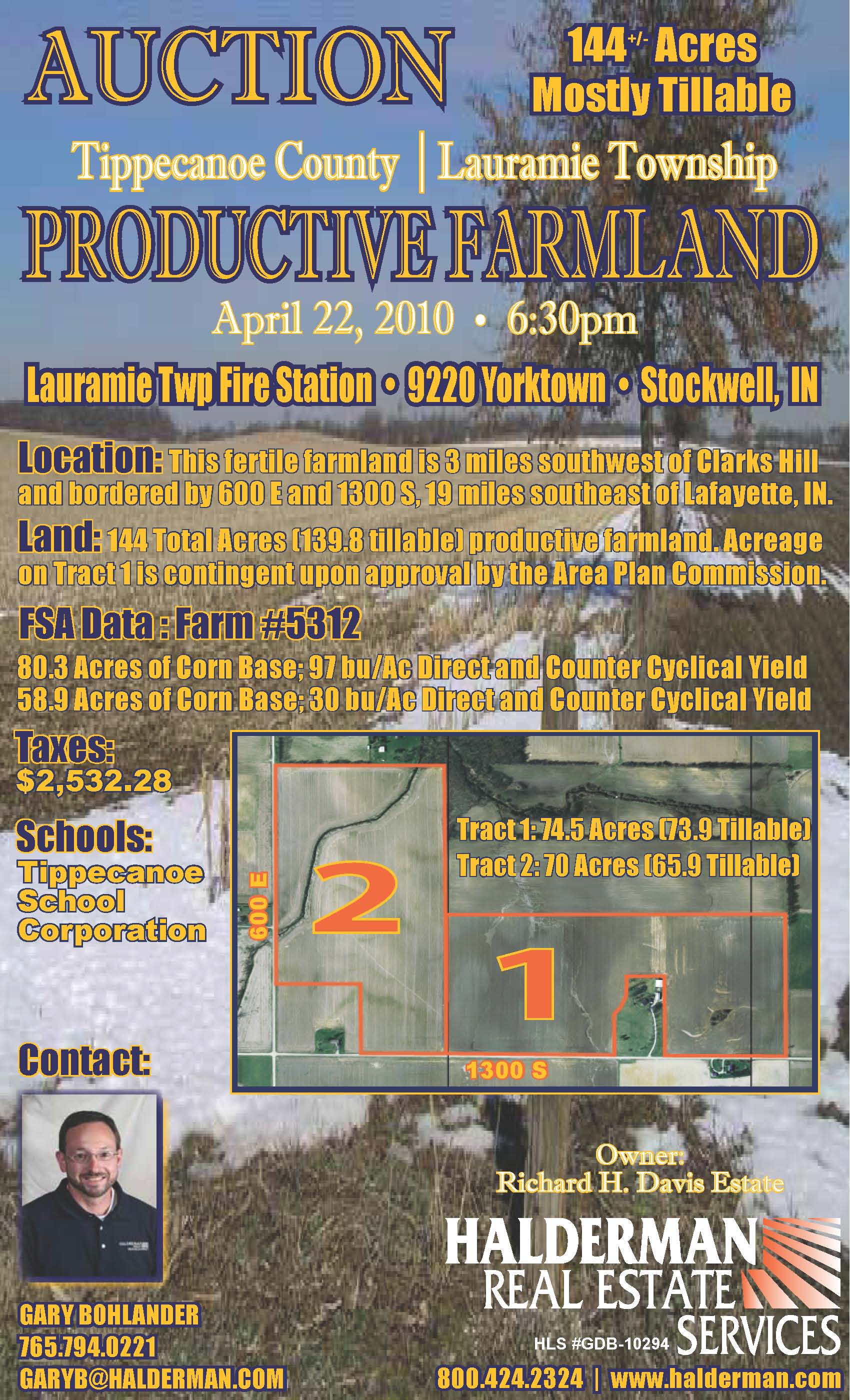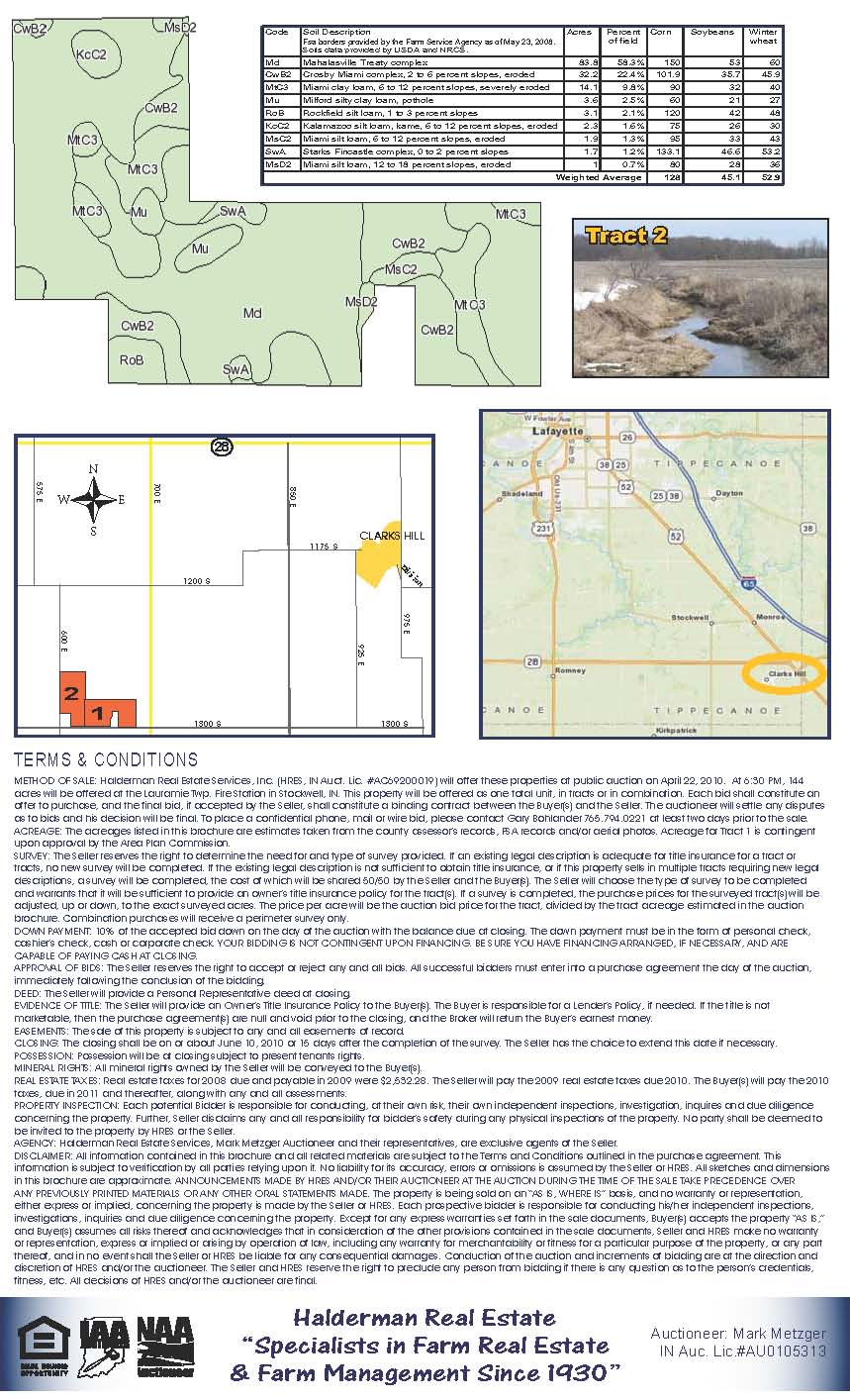 AUCTION: April 22, 2010 at 6:30 pm; located at the Lauramie Twp Fire Station; 9220 Yorktown, Stockwell, Indiana.