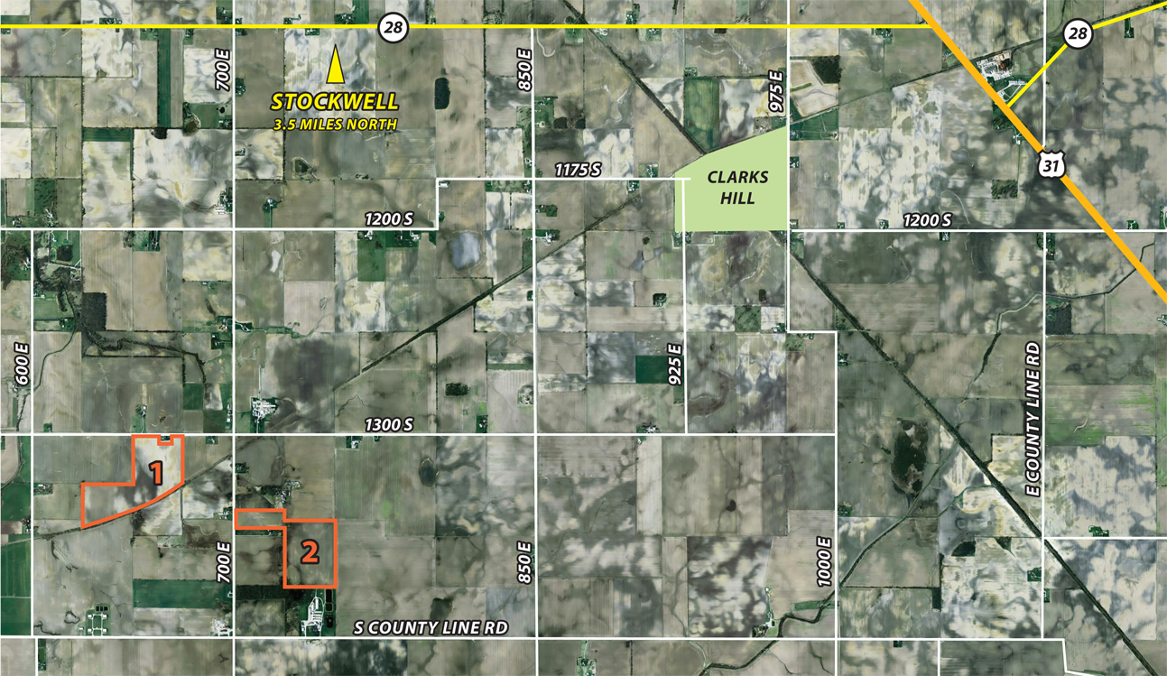 TRACT 1: 77 Acres (76.7 Tillable); located 3.5 miles south of Stockwell on CR 1300 S, .25 mile west of CR 700 E.