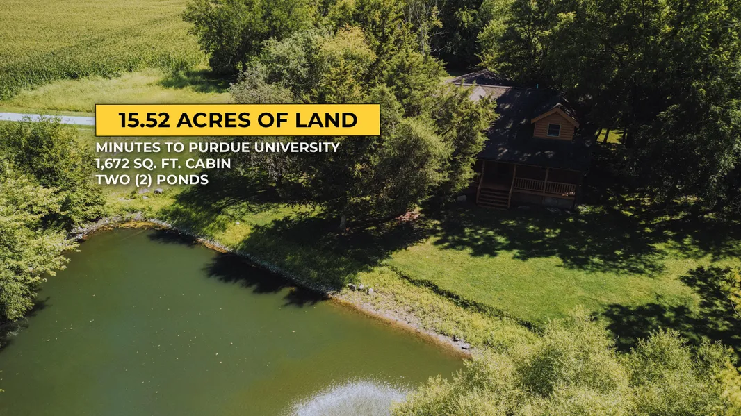 From the moment you drive down the private lane, you'll find yourself in awe of how such a peaceful and private setting can be so conveniently located to West Lafayette and Purdue University. Featuring 15.52 acres of woods, meadows, wildlife and fishing ponds, the log cabin is full of warmth, charm, and offers you plenty of space to enjoy fishing, entertaining guests, working from home, and walking your private trails in the woods.