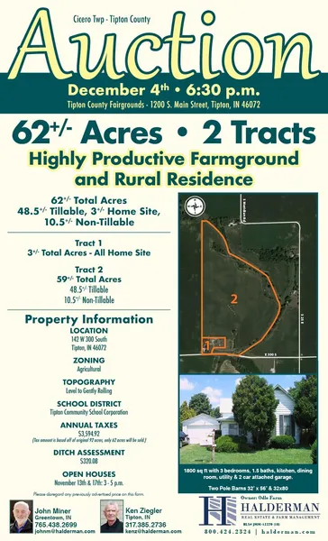 Building Description House: 1800 sq ft with 3 bedrooms; 1.5 baths; kitchen; dining room; and utility. 2 car attached garage Pole Barn: 32x56 Pole Barn: 32x80