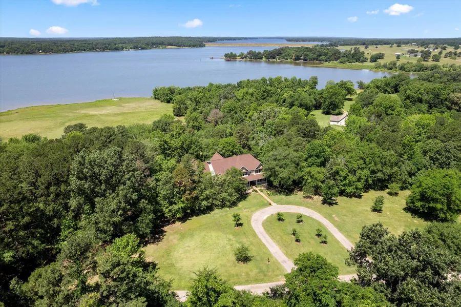 LAKE BOB SANDLIN ESTATE Beautiful 5-bedroom lakefront home with 40 acres and 1000 feet of shoreline on Lake Bob Sandlin. Driving up to the front of this home, you are welcomed with a circular drive and meticulously cared-for grounds. The entry from the front porch takes you into a spectacular curved staircase trimmed with rich oak, an office to the right, and formal dining to the left. Walk into the living room with a full view of the grounds and the lake. The cook's kitchen boasts a 5- burner cooktop, built-in double refrigerator, granite and deep farm sink, an island with breakfast bar, and a spacious breakfast nook with windows looking to the lake. A frosted door opens into the pantry with stained glass, tablecloth rods, and room for seldom-used kitchen appliances and tons of food. The barista area leads into the formal dining area. You can enter the study, formal dining, and sunroom from the front porch through French doors. The sunroom gives access to the back porch, laundry room, and the ensuite guest room or extended stay guest room with ADA standards. The primary retreat has access to the back porch and a nice lake view. The luxurious ensuite bath is what you would expect with a Hollywood tub and direct access to the custom closet with multiple hanging levels, built-in drawers, and a dressing area. The second level has 3 bedrooms, 2 full baths and half bath, media room, second family space, craft room, screened sleeping porch, and access to 2 levels of attic storage. On this level, you can view the water's shoreline from the balcony looking over the living room with a wall of windows. The property boasts a shop with guest quarters, 2 horse barns with stalls, and a tack room. ATV trail, walking bridge over wet weather creek. 1000feet of shoreline is perfect for putting in a sailboat or paddle board. Lake Bob Sandlin is a wonderful fishery with very good bass fishing as well as other species. Schedule a tour of this beautiful Lake Bob Sandlin Estate today.