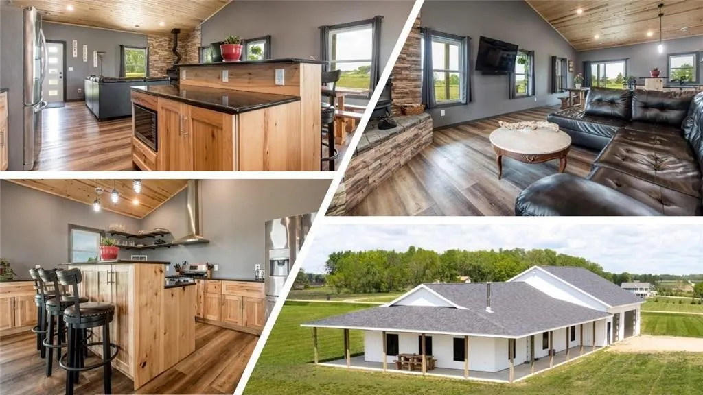 Experience tranquil country living on this nearly 3-acre property. This charming patio home features 3 bedrooms, 3 full baths, and an open concept design with vaulted wood ceilings in main living area. Cozy up by the fireplace on vinyl plank flooring, and enjoy in-floor heat throughout, with additional forced air heating. The spacious kitchen boasts soft-close hickory cabinets, quartz countertops, an eat-in center island bar, stainless steel appliances. Step outside to a large wrap-around patio with hookups for a hot tub and grill for outdoor entertaining. The master suite includes a walk-in closet, private bath with jacuzzi tub, and a tiled walk-in shower with multiple shower heads. Additional amenities include a butler’s pantry with wet bar and cabinetry, and a main floor laundry room. The property also features a 36' x 20' loft for extra space, a 5-stall finished shop with in-floor heat, 12-foot ceilings, floor drains. Enjoy a spacious backyard with 175 newly planted spruce trees.