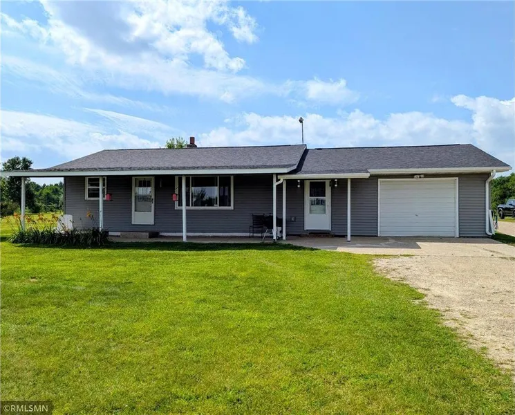 This ranch style home sits on 2 acres with a 30x65 hoop shed with new heavy vinyl roof, an 8x10 storage shed and a 10x16 storage shed with new shingles. The home also has brand new shingles and vinyl siding. The back yard has a fenced in portion behind the home with patio and pergola. The attached garage is insulated and heated. The main level has a heated breezeway leading into the open eat in kitchen, living room with brand new carpet, 2 bedrooms and a full bathroom. The basement has a bedroom with egress window, a laundry and utility area and potential for finishing adding a family room. Septic system has been inspected and is compliant. Just outside of town in a rural country setting. Book your showing TODAY!
