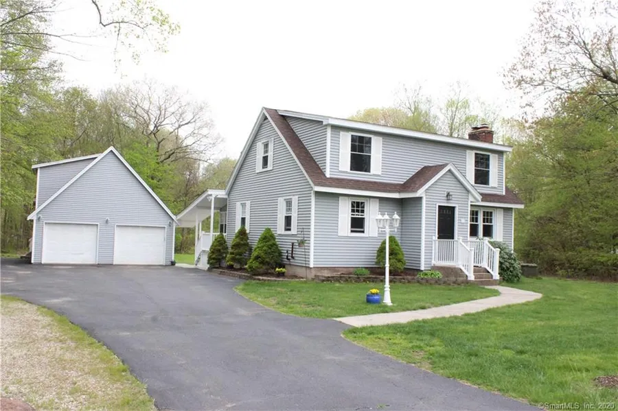 Spacious 3 bedroom cape with front to back living room. Hardwood floors throughout. Propane fireplace living room with sliders to deck. 3 seasons sunroom leading to large 29 x 23 composite deck overlooking level back yard. Kitchen with breakfast bar into dining room. 3 bedrooms on upper level. Master bedroom measures 11 x 17 with hardwood floors and 2 closets, one is a 9 x 8 walk-in closet. Bedroom # 2 measures 14 x 14 with hardwood floors. Bedroom # 3 measures 9 x 12 with carpet over hardwood. Oversized 24 x 30 garage with heat and running water is a great place for a car enthusiast. Upstairs over the garage is a 1 bedroom in-law / teen suite with a bedroom, living room and full bathroom. Quiet country living with easy access to UCONN, Eastern and only 30 minutes to Hartford.