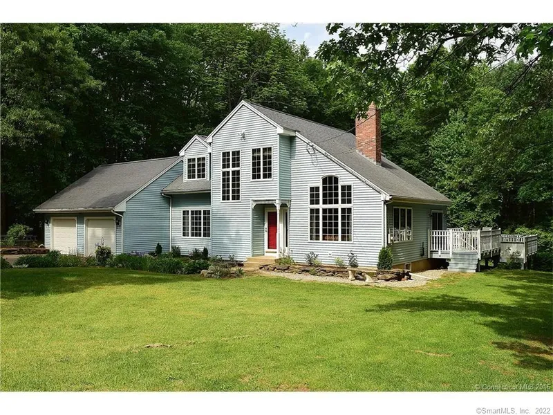This is it! Distinctive-Privately Set Contemporary style home sits on 2.7 beautiful acres in Tolland. Enter into the 2 story tile foyer leading to the great room & dining room area with 2 story vaulted ceiling. A center dual sided floor to ceiling brick fireplace adorns both rooms with custom windows surrounding the home offering an abundance of natural lighting thru-out. LR/Great room has a pellet stove insert w/TV space above, the dining side has an added mantle w/beaut. intimate-surrounding outdoor views. The kitchen is open, eat-in & offers cust. oak accented cabinetry, black appliances & recessed lighting. There is a rear wrap around 2 tier deck from the kitchen around the dining room area. Nicely appointed 1/2 bath off the kitchen is great for when you are entertaining. The Primary suite is nestled away on the main level and offers a tiled full bath and double closets. Upstairs you...