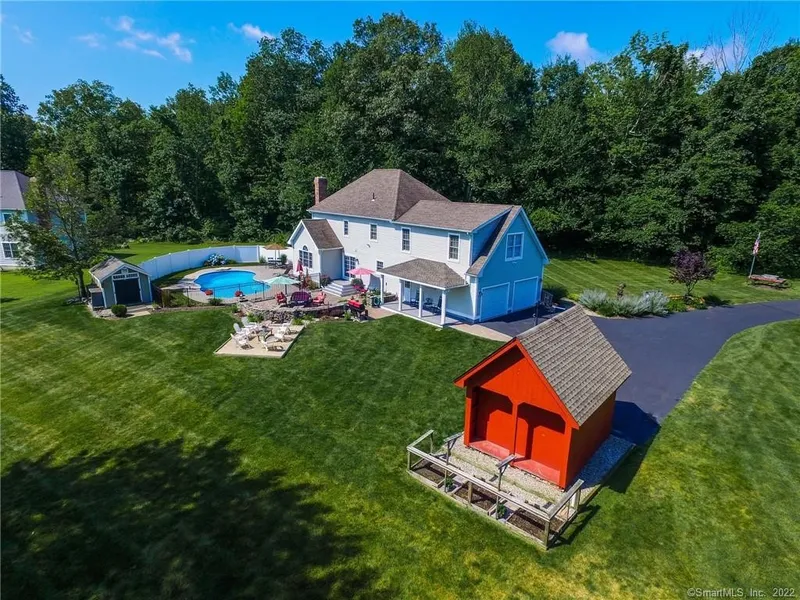 WOW! Pride of Ownership Shows throughout this stunning 4 bedroom classic hip roof colonial with Farmhouse Vibes boasting STAYCATION Inside & Out. A quiet 2.89 Acre lot sets the stage for the outdoor living space with perennial gardens, paver walkways & patios. A true oasis in your own yard featuring multiple seating areas & fire pits, natural stone walls, a grilling station & Memory Making 18x36 Mountain Pond Saltwater Pool & pool house. Sit on the covered back porch & watch the beauty & wildlife of Thorton Brook Preserve go by. Additionally, the custom 12x16 RED Barn, serves as garden storage or workshop.Through the back porch door you will find a cute Mudroom with ample shoe & bag storage. Greet your guest in the 2 story foyer with wainscoting & painted with a classic tea stain faux finish. The open floor plan with hardwood floors throughout flows easily & allows for amazing gatherings. Relax in the great room & keep cozy by the Harman Wood Pellet stove with custom mantle & farmhouse shiplap. A formal open dining room, relaxing sitting room/home office & large eat in kitchen with breakfast bar finish off the first floor. The 2nd floor is host to the 4 bedrooms all with wood floors, the Huge Primary Suite has a second home office with custom built in cherry desk & 2 oversized separate closets & ensuite full bath with shower & freestanding tub. The ultimate Lower level features tiered movie theater & bar style seating, work out area & room for a bathroom. Owner Is Agent