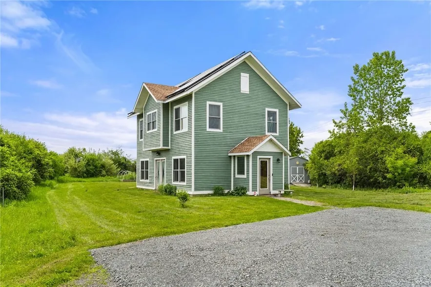 This thoughtfully designed 2015 custom home with locally sourced hemlock siding sits in the highly desirable and peaceful Farm Pond neighborhood. Crafted with care and quality, and has been impeccably maintained. It features an airy open-concept main level including a stylish kitchen with quartz countertops and a farmhouse sink, and cozy hot water radiant heated floor. Upstairs, you ll find warm maple flooring and 3 spacious bedrooms. Enjoy the efficiency and charm of a Harmon pellet stove, a heat recovery ventilation system that ensures a steady flow of fresh air year round, and solar panels that, together with superior insulation, keep energy bills astonishingly low, averaging just $90/month. Step onto the peaceful back deck and spacious yard with a young maple and fruit trees. The home was built by Jack Jensen, known for exceptional craftsmanship. The quiet, resident-used public road offers access to a scenic 1.2-mile nature loop encircling the neighborhood s backyards, along with a beautifully maintained shared pond. Conveniently located: just 6 miles to Cornell University, 8 miles to downtown Ithaca, and 11 miles to Ithaca College