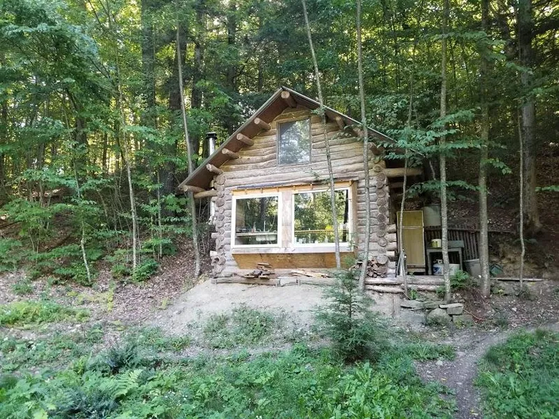 Custom-built rustic 9 x 12 log cabin with loft bordering state forest near Ithaca NY.