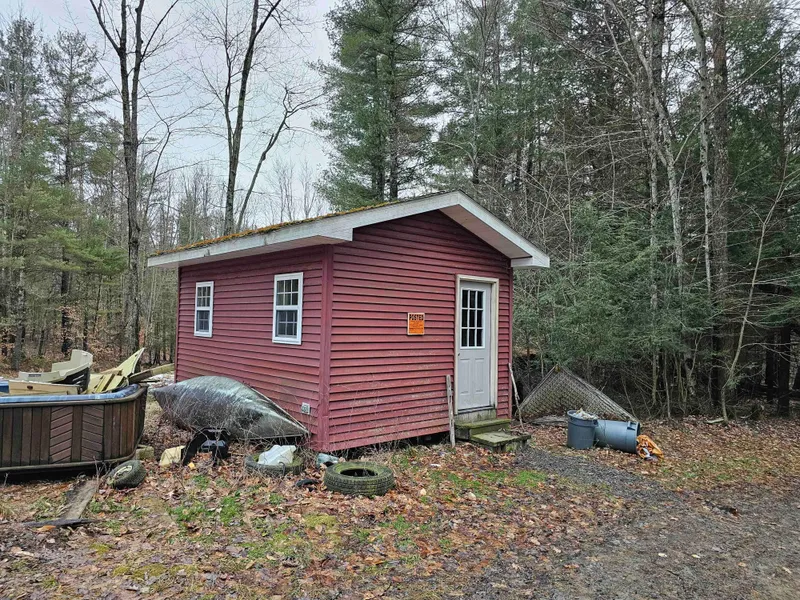This wooded parcel is a diverse property offering multiple species of hardwoods with some pine stands. The hardwoods include red oak, hemlock, maple and beech. There is a gate at the entrance to the property and a well-placed existing driveway leads to the camp. The camp is a small one room cabin which measures 12 x 16 with a propane wall heater, and there is an outhouse. A pole structure is near the cabin that was started with intentions to be built into a shelter for a small sawmill.