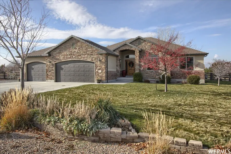 Step into a slice of rural paradise with this stunning upscale 1-acre ranchette in the lovely Spiral Springs Subdivision of Erda. This horse property is the perfect mix of rural living and only 25 minutes from Salt Lake International Airport. The home is a masterpiece of design and comfort. The upstairs features a large open-concept great-room with solid hickory hardwood floors, a beautiful kitchen with newer stainless-steel appliances, granite countertops and custom tile. A spacious primary suite with a private entrance to the covered deck, walk-in closet, bath with an oversized soaking tub and shower with custom tile. Two additional bedrooms and guest bath complete the upper level, offering a perfect balance of privacy and shared spaces. Downstairs, discover a world of comfort and entertainment with a large bedroom and beautiful full custom tile and granite bath, a spacious family room, and entertainment area. Attached to the home is an oversized 3-car garage. Down the gravel drive a 36x48 garage/shop large enough to store your RV, truck, horse trailer, side-by-side, and other toys. The equestrian amenities include a barn with two 16 x 36 stalls and paddocks and a freeze-less Bar-Bar-A horse waterer, and a third smaller stall appropriate for miniature horses, or goats and a covered alleyway to access stall feeders and to use for additional hay/grain or tack storage. The spacious corral is set up as a track system to maximize the space and includes a sand section that can double as a riding arena or round pen space. A hay barn, tack shed and hitching rack round out the horse facilities. If gardening is your thing, you'll love the picket fence lined vegetable garden with several raised beds and a potting bench complete with sink and water supply. A mature fruit orchard with over a dozen trees including several varieties of apple, pear, peach, apricot, plum and grapes. Fully fenced backyard includes a covered porch, lots of mature shade trees, and an 18' above ground pool that is included in the sale of the home (has been taken down and stored for winter).