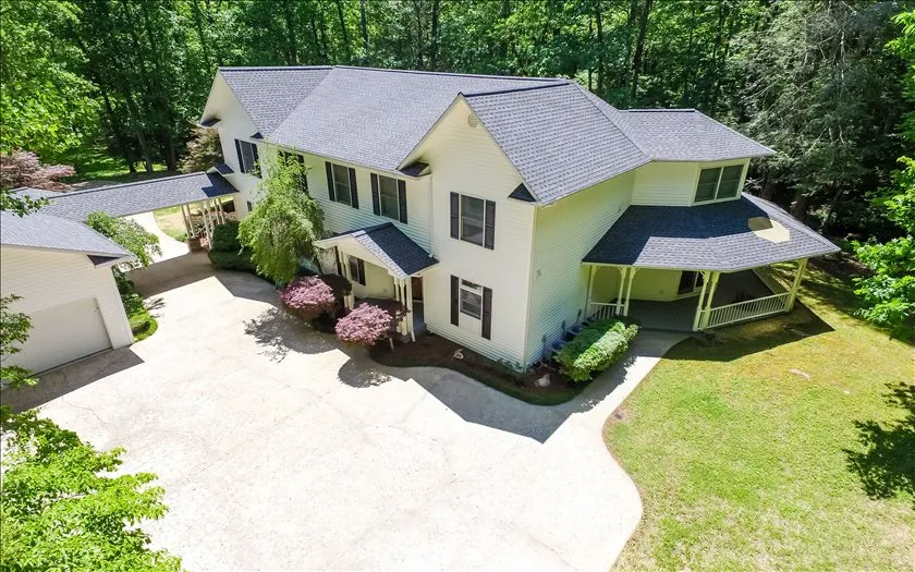 ABSOLUTE PRIVATE NORTH GEORGIA MOUNTAIN ESTATE! Privately nestled in tall hardwoods, adjoining US Forest Service land, this 6+ park-like acre estate offers gated entry, approx 3+ acres of cross-fenced pasture, a barn, 2 creek fed ponds, a wide rushing creek with soothing sounds, concrete fire pit area near the pond house, pond house w/ kitchen w/ full bath & sitting area, oversized 2 bay garage (1 car bay & 1 RV bay) w/ workshop area, level paved access, plus a quality built home of comfort. The main house features 3 master suites, 12 sets of Anderson sliding doors leading to a huge covered wrap around deck overlooking the rushing creek, a x-lg kitchen w/ dining & sitting area w/ fireplace, great room, office w/ built-in bookshelves, lg master w/ lg master bath w/ jetted tub & steam shower on the main level, ultimate man cave w/ bar, duel fuel system + whole home generator, security syst...