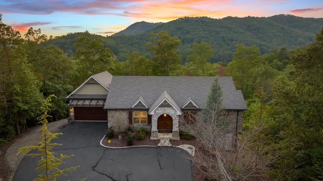 Custom built brick and stone ranch home nestled on a private 2.67+/- acre lot. This gated and meticulously maintained home is a testament to quality and attention to detail. Enter through the gorgeous nine foot wood double front doors to this open concept floorplan with ten foot ceilings, extensive trim, rich hardwood floors, and large windows with breathtaking mountain views. Gourmet kitchen features coffered ceilings, granite countertops, stainless appliances, Butler's pantry, and an abundance of cabinets. Luxurious Primary suite offers a private screen porch with incredible views, tongue and groove ceilings, double-sided fireplace, and large spa-like bathroom that features an oversized jetted tub, large shower, and walk-in closet with built-in shelving. Finished Terrace level provides second living space/media room with kitchenette, along with third bedroom and full bath. Nestled betw...