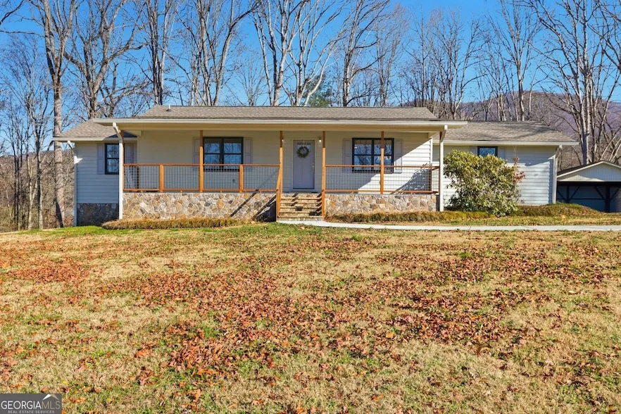 Tucked away on a peaceful 1.026 acre setting in the North Georgia mountains, this opportunity offers a private and scenic place to call home with Bell Mountain views greeting you from the front porch. This ranch style home provides comfortable main level living with 1,744 finished square feet, three bedrooms, and two full bathrooms, all thoughtfully updated during a complete main level renovation completed in 2023 that included the primary bath addition. The open layout welcomes you inside, where the kitchen serves as the centerpiece of the home with white shaker style cabinetry, quartz countertops, stainless steel appliances, and a large island that anchors the space. A gas range is built directly into the island with a stainless steel vent hood above, along with a convenient height oven and microwave combo, creating a polished and functional cooking space. The kitchen overlooks the living room, offering a natural flow that works well for everyday living and entertaining. Just off the living room, the front door opens to the front porch where the mountain backdrop adds a true sense of place. The kitchen also features a pantry, and the main level includes a laundry room with exterior access and a well designed mud room coming in from the one car garage, complete with built in cabinetry extending to the ceiling. Two secondary bedrooms share a full hallway bathroom, while the owners suite is privately situated and features two walk in closets and a spacious bathroom with double vanities, a standalone soaking tub positioned beneath a large window overlooking the wooded backyard, a beautifully tiled walk in shower, and a separate water closet. Major systems updates provide added peace of mind, including a newer roof approximately two years old, a newer HVAC system, and a newer water heater. Both the front porch and the back deck feature Trex style decking for durability and low maintenance, and the back deck includes stairs leading down to the gently sloped wooded backyard. The front yard is also gently sloped and nicely sized, and the driveway includes a carport that offers additional covered space for storage or equipment. The full unfinished basement offers 1,463 square feet of future potential and includes its own washer and dryer hookup, an exterior door, and a garage door, making it ideal for storage, a workshop, an at home gym, or future finished space. Thanks to floor trusses above, the basement offers excellent ceiling height and an open feel without the need for posts throughout. Located in the beautiful Hiawassee area near Lake Chatuge and surrounded by mountain scenery, this property offers a peaceful setting while remaining convenient to town amenities. Listing agent is related to the seller.