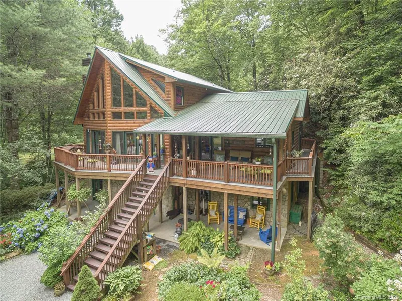 Custom Built "Lincoln Log" Home on a "Superior Walls" Concrete Foundation with Finished Basement! Sturdily Built by the original owners! Chestnut Cove Log Homes was the owners company, they built this amazing house for themselves! Constructed with care and precision! Middle Fork French Broad River runs through the front yard past the beautiful custom gardens! A Bold Rushing Water Creek comes from the forest in back and flows in front of the house, thru the Gardens, and into the river right to the side of the house! What a setting! 16+/- acres! Four distinct bedrooms, three bathrooms, a stellar kitchen/dining area! Two story great room with an all windows wall that looks out to the mountain view across the way! Fireplaces on two levels! Never before on the market, this house has huge appeal! Features a two car garage, a large metal RV Shed, vegetable garden area, tool and equipment shed, ...