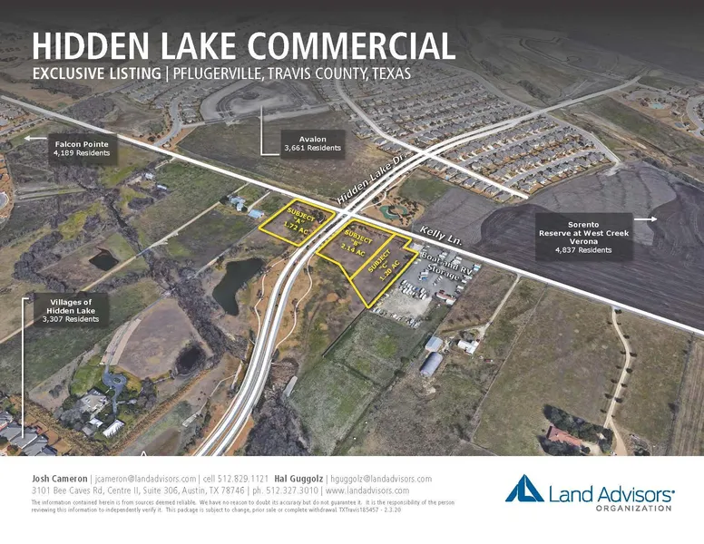 These ideally positioned tracts are located in the rapidly developing East Pflugerville sub-market of Austin, at the intersection of Kelly Lane and Hidden Lake Drive. About 37,110 residents reside within 3 miles of the subject properties. These pristine properties hug the beautifully manicured entrance to the Villages of Hidden Lake, making it a desirable location for retail and commercial businesses. With little commercial presence in the corridor, this makes it a great opportunity to take advantage of the demand created by the developing communities surrounding the subject properties.