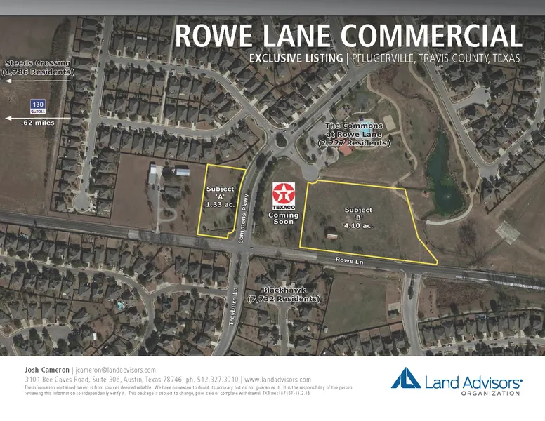 These ideally positioned tracts are located in the rapidly developing East Pflugerville sub-market of Austin, at the intersection of Rowe Lane and Commons Parkway. Just over a half mile east of SH-130. About 44,134 residents reside within 3 miles of the subjects.These prime properties hug the beautifully manicured entrance to The Commons at Rowe Lane, making it a desirable location for retail and commercial businesses. With little commercial presence in the corridor, this provides a great opportunity to take advantage of the demand created by the developing and established communities surrounding the subjects.
