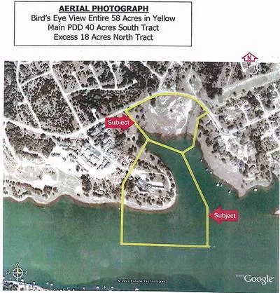 Property: Beautiful 58 acre natural peninsula on the main body and a cove of Lake Travis. Main body frontage of 700 lineal feet will never go dry. Out of the 58 acres, 4 acres is located above the new FEMA flood plain level for Lake Travis of 722 feet msl. This is sufficient site area for the 150 - 225 unit waterfront condominium project.