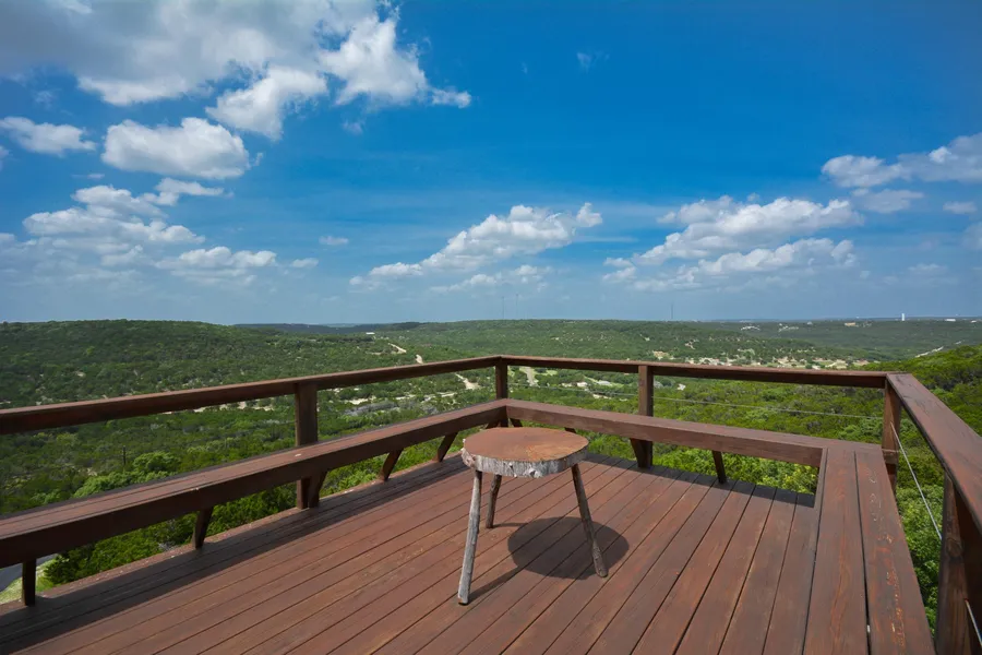 This great Hill Country estate offers panoramic views and great elevations. Perched above, this home balances contemporary with the classic. Among its features are an open floor plan, mesquite wood floors, gourmet kitchen, and private guest quarters with bath and separate entrance. The north side of home faces out into nature with a large outdoor living area accessible from master, living, and additional bedroom. The outdoor living area also offers a full kitchen, with fridge, sink, ice maker, and grill.
