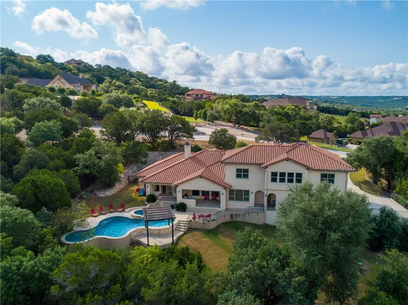 Residence Features highest quality standards and finishes with exceptional craftsmanship. Very Serene and treed private setting 1.4 Acre lot with a beautiful pool and spa. This 5 bedroom, 5 1/2 Bath home 4,954 SQ FT Home has a Study, 3 car and private driveway. Great Master Suite is on the main level. Bedroom suite on the main level for guests. Gourmet Kitchen and Formal Dining. Beautiful hill country VIEWS and Beautiful SUNSETS. Close to Dell, Apple Campus, Google and Hospitals. Sprinkler Sys:Yes