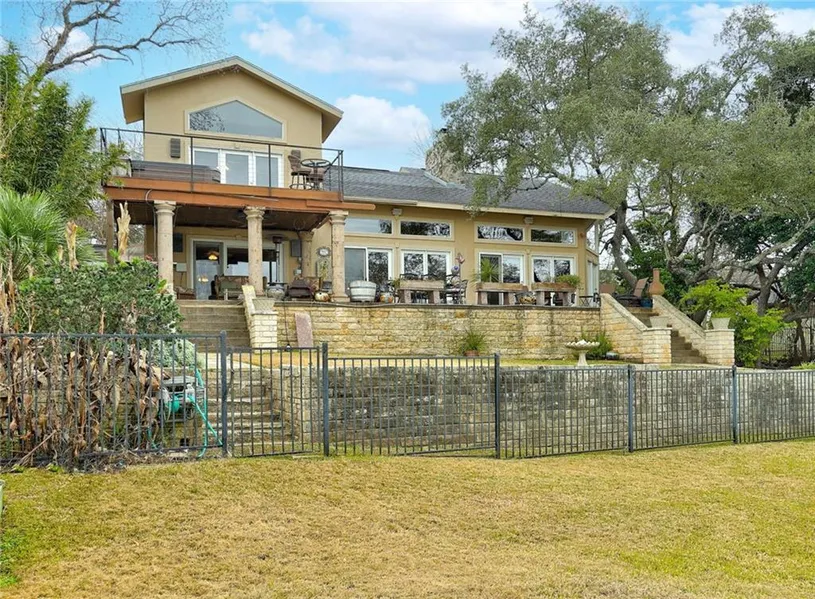 Elegant waterfront custom home on deep water (never went dry in droughts) offers unparalleled craftsmanship and exceptional amenities. This lake inspired design is truly remarkable inside and out. Huge windows provide plenty of natural lighting, expansive outdoor living, gourmet kitchen (great for entertaining), gorgeous master suite, office, built-in storage, two slip boat dock accommodates 26 foot boats, plus STUNNING views of lake Travis in a high demand area. Community park & playground. Marina with fuel, golf course, hike-n-bike trails. Your family and loved ones will enjoy this lake life. Come and take a look at this beauty.