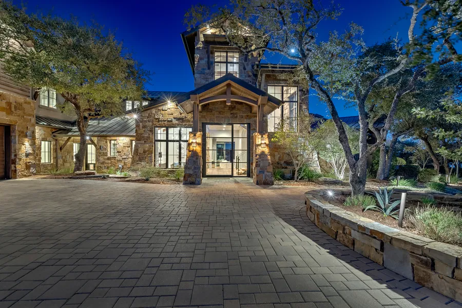 A beautiful home that seems straight from the slopes in Aspen, 11901 Yaupon Holly Lane exudes a sense of warm, stylish luxury. Perfectly situated on 2.3 aces on one of the most highly regarded streets in Spanish Oaks, the Estates Collection. This home was thoughtfully designed by the owners in collaboration with architect Kai Geschke as an open and functional floor plan, making this transitional masterpiece an entertainers delight together with a family-friendly concept. Luxurious details balance the modern touches which include steel, timber, stone, and handmade light fixtures. Upon entering through the custom Fleetwood glass and steel front door, an impressive staircase comprised of solid maple steps adorned with glass and steel railing welcomes you home. Wide planked Texas Post Oak floors guide you throughout every turn on the main level. The kitchen truly is the heart of the home and has been masterfully designed to seamlessly flow between the breakfast area and living room. A hand-forged steel vent hood compliments both the rift-sawn white oak cabinetry and glass tile backsplash. Professional stainless appliances including: 60 Sub-zero refrigerator/freezer; two Bosch dishwashers; two Wolf ovens (including a steam oven), and warming drawer. A built-in Miele coffee bar adds an extra touch to the double-island kitchen. Large Fleetwood sliding glass doors showcase the hill country views, and welcome in the outside with the relaxing sounds of the water feature in the resort-style swimming pool. Stylish and sleek, the first-floor master bathroom is dressed in marble and travertine and has an oversized walk-in closet with the convenience of a built-in washer/dryer, ironing station, and coffee bar. The equally stylish master bedroom has a chic fireplace, hill country views, and motorized blackout shades. The first floor also features a large guest suite and ADA compliant spa-inspired en suite bath. The Cabana is conveniently placed adjacent to the kitchen and serves as a secondary living space/game room. The casual, fun space has a bar, linear fireplace, views, and oversized Fleetwood sliding doors to the outdoor patio space and pool. The covered outdoor kitchen and loggia feature a BBQ grill and Big Green Egg with ample seating around a large granite counter. The covered patio has many seating and entertaining areas, and lower decks allow for sun worshiping and stargazing next to a lovely fire pit. The multi-terraced, private backyard lends itself to a multitude of activities including a 70 fully enclosed batting cage/ driving range, and 40 putting green with a chipping pad. The second floor enjoys two secondary bedrooms with ensuite bath and motorized hidden blackout shades. A variety of living areas include a workout room with mirrored wall and captivating hill country views, and media room with newly installed (2018) AV equipment. Neatly tucked away through a hidden doorway finds a gigantic playroom/flex space, not to be outdone by the private executive office with ventless Ecosmart fireplace and endless hill country views. Thoughtfully designed, the laundry room offers a bright and spacious secondary workspace including a wrapping paper station, laundry chute from an upstairs bedroom, hidden kennel, pet food storage and desk area. The mudroom just off the garage offers a space for backpacks, shoes and sports gear, all the while maintaining a neat and organized look. Energy-efficient, green features include foam insulation, steel Anderson windows, Fleetwood doors, and Big Ass fans. Utility costs are amazingly low! Smart home automation is controlled by Control4 and includes lighting, audio/visual, security, Nest thermostats, and pool automation for seamless entertaining at a touch. Lastly, the three-car oversized garage features epoxy floors, dual electric car plug-in, and car lift potential.