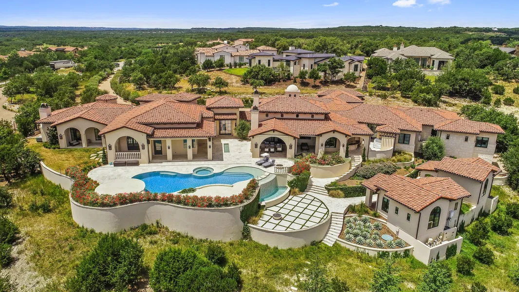 Perfectly situated on three private acres with sweeping Hill Country views. This timeless masterpiece, created by Bob Whitmore of Cornerstone Architects, was completed in 2017 and resides in the highly sought after golf community of Spanish Oaks in Austin Texas. The 24-hour guarded gate ensures exclusive access to homeowners who include professional athletes, country music stars, as well as business owners and entrepreneurs alike. Adorned with lanterns and olive trees, the gated private drive guides you to the expansive motor court. A stunning hand-cut stone arch entrance is flanked by a Koi pond and gas lanterns. The wide-planked hickory pecan hardwoods laid in a perfect chevron pattern guide you down the extra-wide hallways to the dedicated wings for both adults and children/teens that creates the perfect balance for an active family. The master suite offers a refuge for the owners, complete with a hand-carved stone gas fireplace in the sitting area, motorized drapes, bespoke lighting fixtures, polished Calcutta countertops, honed Calcutta floors, inset painted cabinets, a triple steam shower, towel warmer, a backlit mirror for him and commercial makeup mirror for her and custom-built floor to ceiling closets with glass enclosures. The children/ teen quarters offer four generously sized bedrooms with en suite baths dressed with marble finishes. The youth common area offers a built-in vestibule perfect for card games with a seamlessly hidden secret passage to the catering kitchen, chalkboard wall, a pair of rattan chairs anchored from the ceiling, as well as dual access to both the turf sport court area and pool. Designed as a stark contrast from the rest of the home, the ambiance of the oversized entertainment room transforms throughout the day from light and open to inviting and sensual that feels like a sleek and stylish Manhattan bar. The extra-large leather sectional conveys a cozy space to cuddle up for a movie, play X-Box with the kids, or perfect your swing with the golf simulator. Invite your personal trainer to your very own private gym. The living room and kitchen are truly the heart of the home and are surrounded by an abundance of natural light. The living room is embellished by an impressive chandelier commissioned out of San Miguel de Allende paired with replicas of French lanterns that hover above the butcher block kitchen island, accompany the Le Cornue stove, Sub-Zero refrigerators, Miele coffee maker, caterers kitchen, and custom made smoked mirror and steel sliding doors. A pair of casitas are perfectly placed for guests to enjoy their own resort-like setting with a kitchenette, washer/dryer, full bath in the adult casita, and double bunk beds in the kids casita. Adjacent to the 4 car garage is a separate 3 car, air-conditioned garage fashioned with overhead lighting to spotlight your favorite collectibles. Sweeping hill country views set the scene for the outdoor travertine terrace and pool. The loggia is accompanied by inset ceiling heaters, motorized screens, fire bowls and a double-sided fireplace - a perfect place to relax or entertain. Savant home automation includes the ability to control lighting, HVAC, security cameras, and whole-house audio. Casa Krause truly exudes elegance and luxury at every turn.