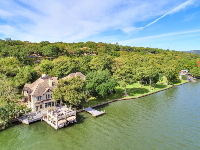 With approximately 400 feet of waterfront on the most coveted stretch of Lake Austin, this jaw-dropping French Normandy-style manor sits on a stunning 1.5 acre lot. Custom built with expert craftsmanship, this spectacular estate is fully-gated and unmatched in location and privacy. Expansive green space leads to an elaborate boat dock with two slips and a spacious party deck above. Multiple outdoor living areas take advantage of the gorgeous landscape while a wine room and home theatre accommodate upscale entertainment indoors. Four en-suite bedrooms equip the main home, and a complete guest house is seated above the 5-car garage featuring two additional en-suite bedrooms. Truly in a league of its own, this waterfront manor will elevate your lifestyle with each dazzling sunset.