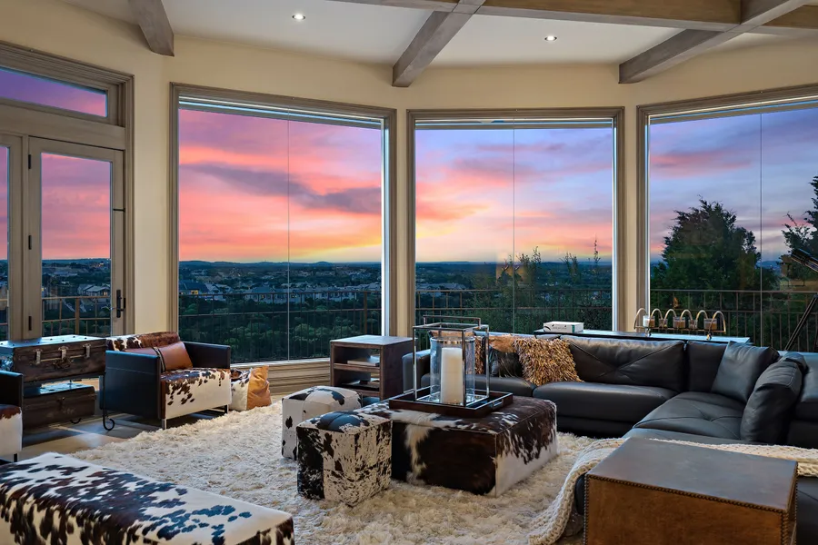 Nestled off the street and situated on over three and a half acres of native landscape, this transitional style home with a contemporary flair was recently remodeled boasting flawless attention to detail, emphasising the awe-inspiring panoramic views. Large steel and glass doors welcome you inside to a two story foyer featuring a grand staircase, and white oak wide plank flooring leading you throughout. The spectacular main living features a custom steel fireplace, an entertainers sleek wet bar, high beamed ceilings and floor to ceiling windows overlooking the hill country. The gourmet kitchen seamlessly connects from the formal dining through the butlers pantry and is complete with a breakfast bar, oversized island, walk in pantry and separate coffee bar nook. The primary suite features high ceilings and two separate baths with luxurious finish outs. The primary level is complete with...