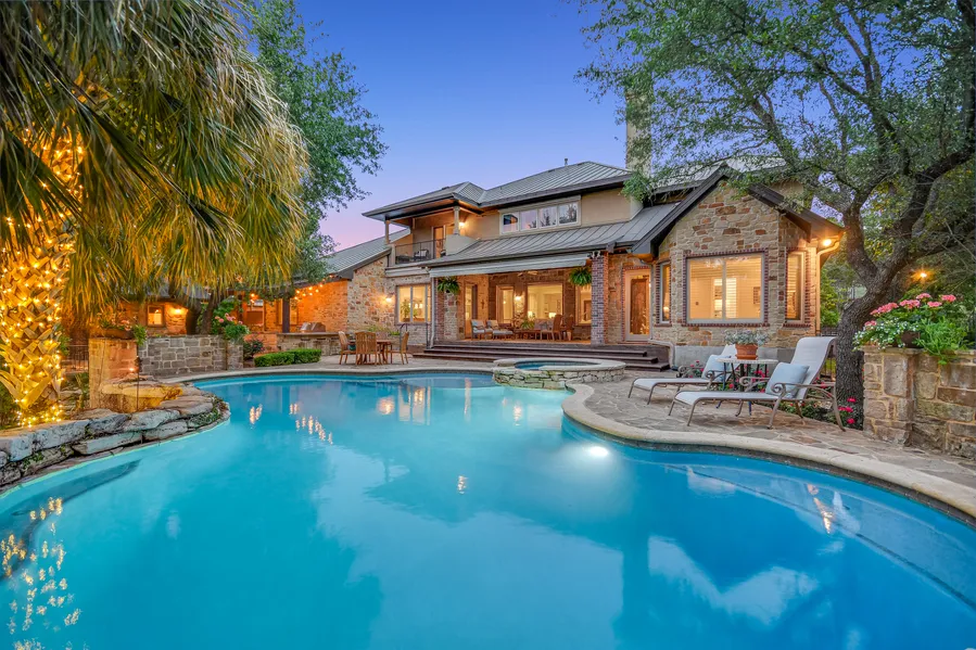 Custom designed in every detail, this home was crafted by premier builder Russell Eppright. The floorplan can accommodate formal entertaining, including an elegant wine bar and lounge, plus informal gatherings of family and friends in the fireplace-warmed family room. A gourmet kitchen overlooks the family room, breakfast room, and the covered terrace outside allowing the cook to be part of the activity. The sumptuous main-floor master suite opens to the terrace as well for easy access to the pool and hot tub; it also enjoys an oversize closet and large bath. On the upper floor, four bedrooms surround a media room with a state-of-the-art projection system, allowing kids their own space to share with friends. An oversized utility room with a custom dog kennel offers space to unload groceries, work on crafts and keep clutter at bay. A gated driveway entrance with five garage spaces within a stately courtyard entrance provides ample parking for guests on-site or along the tree-lined cul-de-sac street.