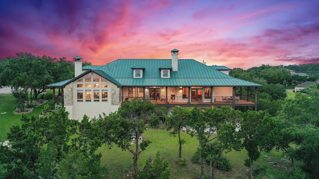 Poised on a hilltop just outside of Lakeway, this distinctive property provides an abundance of privacy and tranquility. Built by Sierra Homes, on almost two acres, this timeless floorplan offers substantial living spaces, a gourmet kitchen, dining areas for entertaining, wrap-around porches, and breathtaking views. Stunning pine beams, plentiful built-ins, 5 Fireplaces, a home office, and an oversized utility room are added bonuses.
