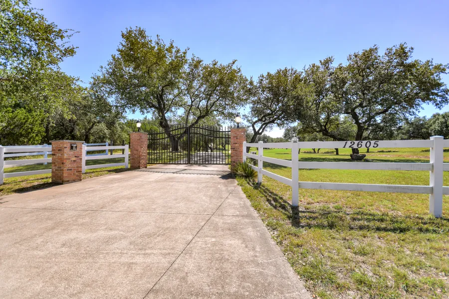Beautiful and private! 10.237 acres within thirty minutes of downtown Austin. Panoramic views of the Hill Country. Perimeter fenced with remote gate entry. Paved driveway leading to the perfect five bedroom/three bath home on the hill surrounded by towering oaks and inviting porches to enjoy the breeze and the view. A wet weather creek runs through the property and feeds the pond. This property is unrestricted so bring your imagination and envision a wedding venue, a corporate retreat, a bed and breakfast, or bring your horses. Perfect for the hobbyist who enjoys restoring vintage cars: the oversized metal building already has the car lifts in place and can accommodate several cars! Plenty of parking for almost any kind of event. Eight hundred foot well; Aerobic septic system. Truly unique.