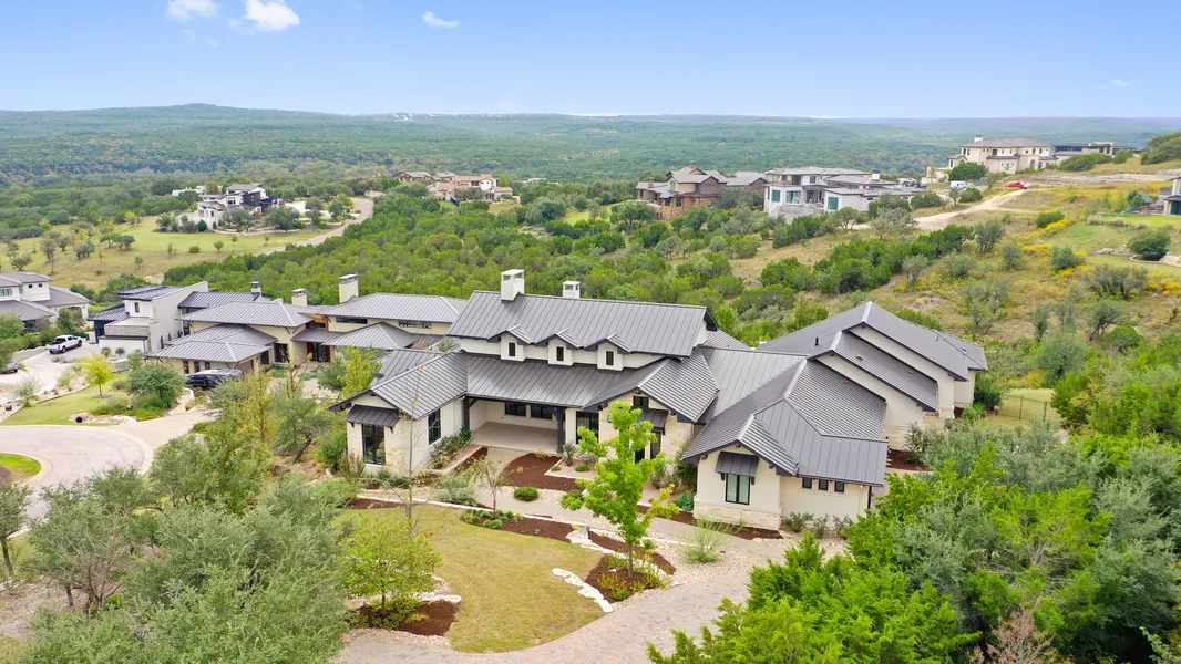This contemporary single-story property is perfectly situated on a cul-de-sac for privacy and Hill Country views. The open concept floor plan allows for endless indoor and outdoor everyday living and entertaining. Copious amounts of natural light from a wall of windows fill the kitchen and great room. The dining room lends itself to an intimate gathering or grand dinner party with an adjacent wet bar. Hardwoods floors throughout the home extend into the generously sized bedrooms with en suite baths and walk-in closets. The owner's suite offers another layer of privacy with motorized blackout shades and custom track drapery. Indulge in the spa-like spacious primary bathroom with a double walk-in shower, his and her vanities adorned with quartz countertops, neutral color palette, and nickel hardware finishes. The light-filled office can double as an additional sixth bedroom or flex space. The secondary living room has 18 foot beamed ceilings, can be used as a playroom or media room.