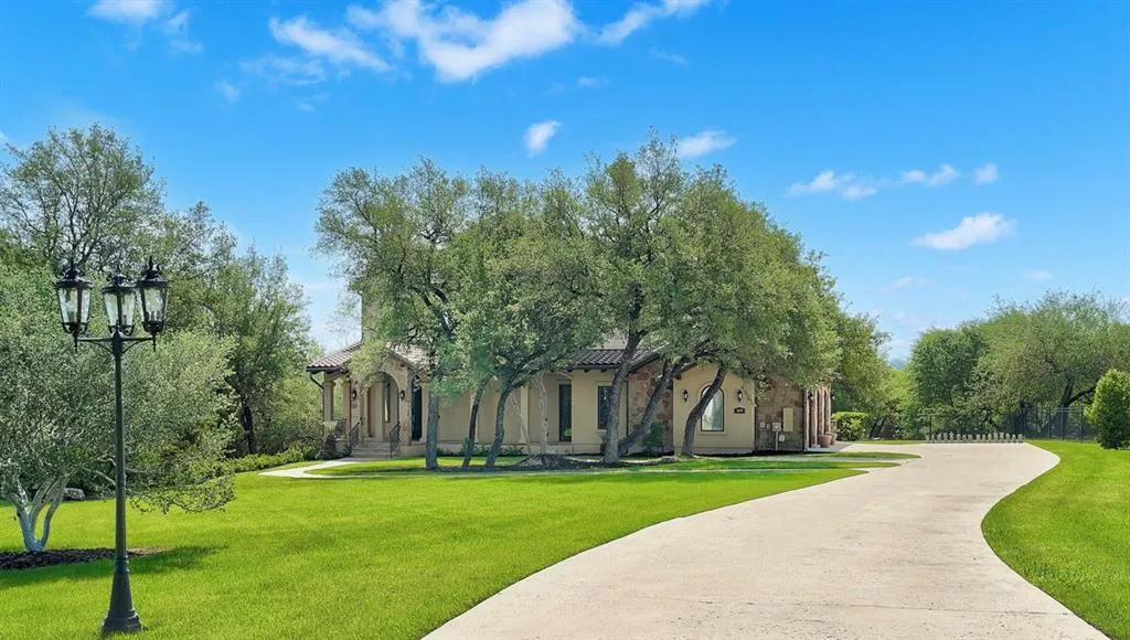 Nestled away from all the noise of traffic, this Mediterranean inspired home sits on a one acre lot shaded by mature trees. With only eight homes in a secluded gated enclave, this majestic property is a dream for entertaining with an abundance of parking. The 30 feet cathedral ceilings & the Cantera entryway door allows ample natural light to brighten the open living space. Desirable features in this 4,279 sq. ft. home include two primary suites with luxurious ensuites, 3 guest bedrooms, including 2 powder rooms one outside on the veranda & the other downstairs. Additional features are 8' doors, 10'-12' ceilings, hand scraped hardwood floors, travertine tile & carpet in the bedrooms. The stunning chef's kitchen boasts a large granite island, custom cabinetry, stainless Viking professional appliances & a 6 gas burner cooktop & oven, wine refrigerator & wet bar, coffee bar, butler's pantry, and much more! French doors, both upstairs & downstairs lead to two covered terraces perfect for gatherings. The upstairs terrace has distant views of Lake Travis. Outdoor features include a swimming pool, hot tub, water feature, covered terraces, a built-in grill with cabinets for storage & a completely fenced yard. The three-car garage has ample storage, including overhead racks. The Property is conveniently located near the Hurst Harbor Marina, restaurants, shopping and more.