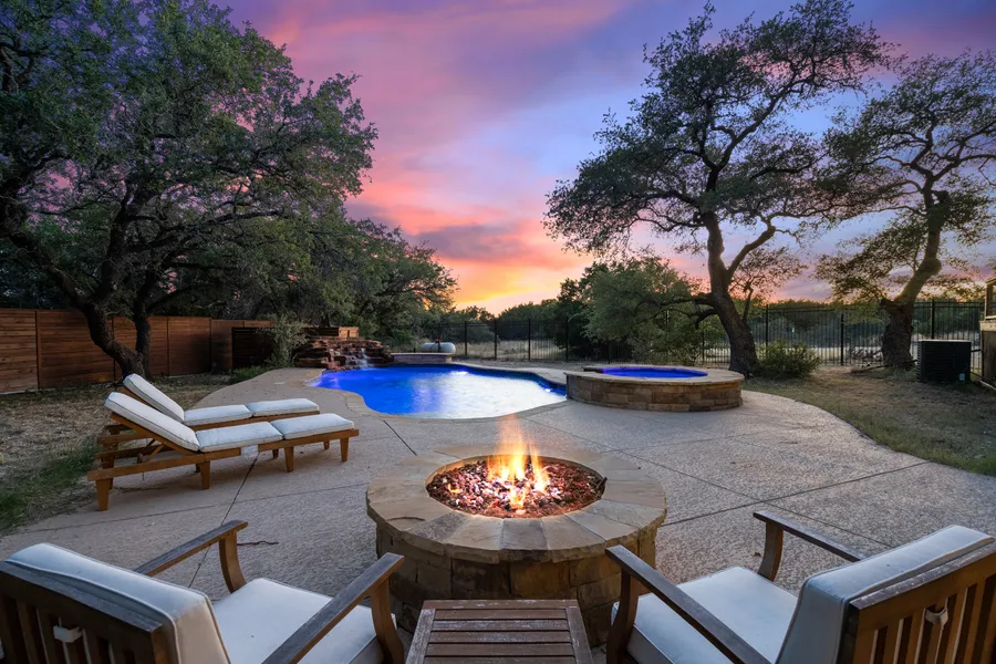 Fall in love with this epic Texas Hill country dream estate. Nestled in a prime location on 5.01 acres just 25 minutes south of downtown, this three-bedroom home with a guest house has an Austin address while feeling like a country oasis, offering the best of both worlds the exceptional Dripping Springs schools with a coveted retreat with abundant nature and greenery. Beyond the gated driveway, the limestone faade, commercial windows and massive oak trees draw visitors to this stunning home. Panoramic views abound from the newly replaced 2,000 square feet of decks with seven access points to the house making this the ideal place to entertain guests and soak in the surroundings. Through the front door are beautiful shiplap soaring ceilings 20 feet high that culminate in the Great Room. The rest of the home has ceilings ranging from 10 feet to over 24 feet high in the primary bedroom with a unique cat-walk library. The primary bedroom suite has three walk-in closets, two exterior doors for deck access, extraordinary views of grand oak trees, and an en suite bath with dual hammered copper sinks, a large soaking tub and room for an exercise bike or sauna. Upstairs is a large bright and light bedroom with vaulted ceilings. The guest house, connected by a footbridge to the main house, has a large bedroom with a full bath and a fully enclosed courtyard with a fire pit. It offers privacy, intimate gatherings in dozens of rooms or nooks around the property, poker nights, billiards and darts gatherings or a big backyard pool party.