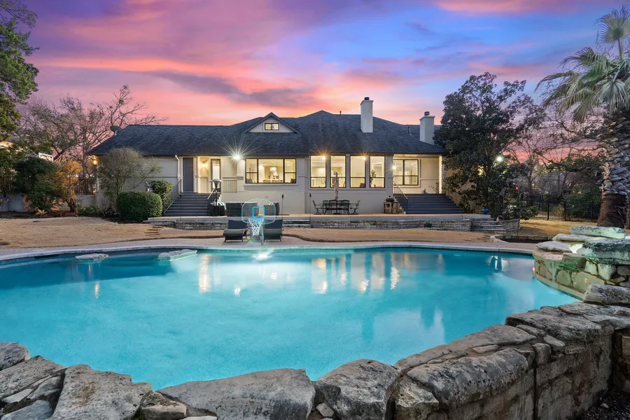 One of the largest homes on one of the largest lots in The Uplands, this home is nestled on a quiet street with stunning curb appeal. This property sets itself apart from the rest with its serene location, stunning features and lovely detail. The home boasts an open layout with natural light radiating throughout the home. The great room opens to the kitchen and the sunroom. The chef's kitchen boasts double ovens, double microwaves, granite counters, an oversized island as well as an abundance of storage space. The home features three living areas downstairs as well as the primary bedroom and two additional bedrooms. The second floor includes two bedrooms, a media room, and a game room. This home is particularly lovely and provides so much opportunity for any buyer. Multiple living spaces and custom details provide incredible merit to this property. The 1.27 acres of outdoor living are equally magnificent with grand curb appeal. The heated pool/spa, fire pit, entertaining area and large storage shed are evidence that every detail is accounted for in this idyllic home.