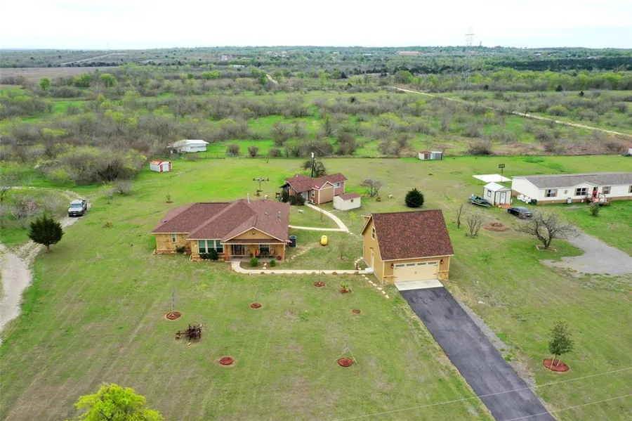 This stunning 3 bedroom/2 bath home sits on 5.19 acres of unrestricted land, the perfect oasis for those seeking luxury and privacy. The home has many upgrades such as granite countertops throughout, recessed ceiling and lighting, beautiful glass shower doors in the master bath, and gorgeous ceramic tile flooring that provide a sleek and modern touch to the home. The kitchen has stainless steel appliances, kitchen island, and a cozy breakfast area perfect for family meals. In addition to the main house, there is a separate 1 bedroom/1 bath guesthouse in the back of the property with its own kitchen, vinyl wood flooring, and a relaxing front covered porch, offering guests privacy and comfort. This property also has a detached two car garage that includes a spacious bonus room which adds even more space for visitors or family members. This property is located right off the TX-130 toll road...