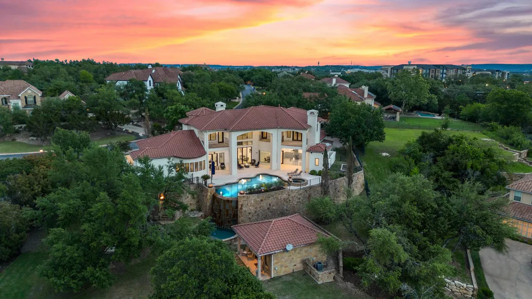 A spiral staircase with custom chandelier takes you to the second level which features 3 bedrooms, 3 full bathrooms, a game room, home theater room and multiple terrace-style balconies.