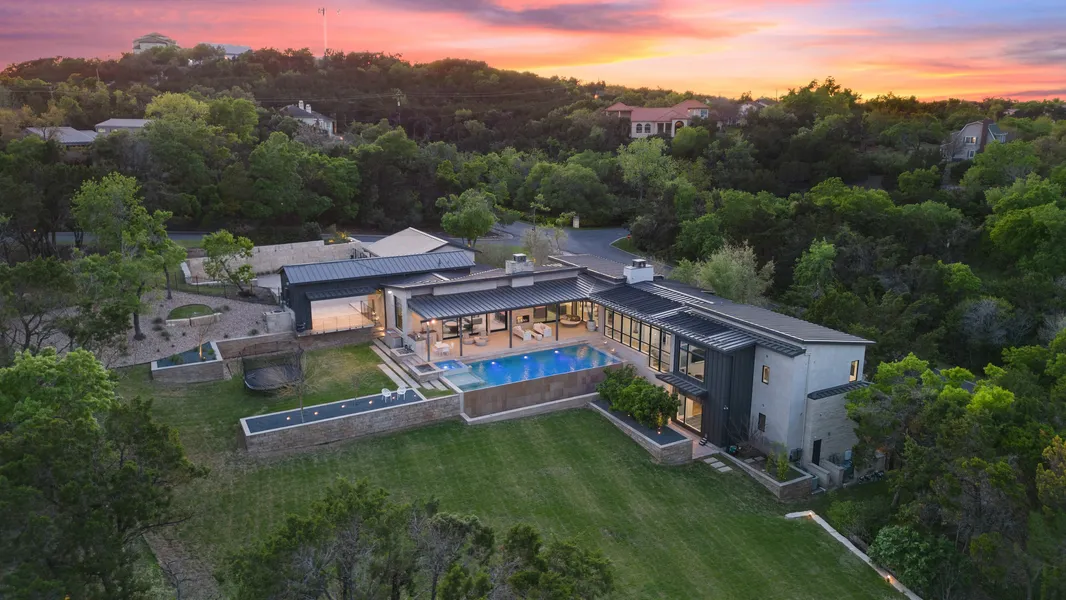 Designed by Larue Architects and built by Shoberg Homes, this residence sits gracefully at the highest elevation of the expansive, private corner lot and offers sweeping views of the property.
