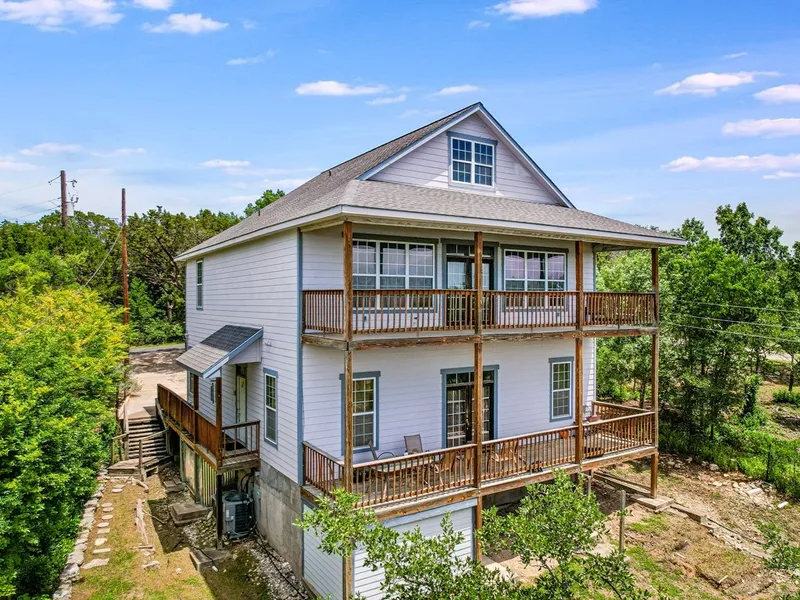Lake Travis Waterfront Home on Very Deep Water in Volente on the Big Sandy Creek Arm near the Main Sailing Basin by Starnes Island. Excellent deep water boat dock site. Entry level has in-law plan with den, wet bar, full bath, bedroom plus large outdoor deck. Entry foyer with laundry closet, and door under stairwell into private office with Lake view window. By garage is access to music studio/media room or workshop with half bath. Upper level primary suite with 2-bedrooms, 2-full baths, and full kitchen with built-in oval breakfast bar or gaming table. French doors to large covered outdoor decks. Attic storage room has Lake view window. All levels have scenic hill country and Lake Travis views. Zoned Single Family Residential SR-1.