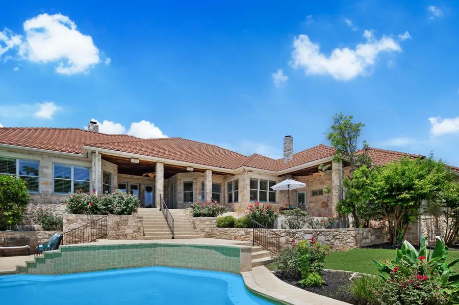 creativity. Whether you're hosting intimate gatherings or preparing meals for your loved ones, the seamless flow between the kitchen, dining area, and living room creates an inviting atmosphere for entertaining. Natural light floods the interior, accentuating the beauty of the surrounding landscape. A spacious primary suite is its own private retreat overlooking the verdant backyard offering a generous bathroom with an expansive double vanity, soaking tub, & European shower along with a large walk-in closet. The property also features an office with fireplace & built-in book shelves in addition to three bedrooms & multiple living and dinning spaces. The outdoors are an extension of the home's beauty, featuring a covered patio and deck where you can unwind and entertain soaking in the pool and greenbelt views, privacy abound. Boasting a seamless blend of comfort and style, this property is a true gem, immerse yourself in its serenity and elegance with breathtaking views.