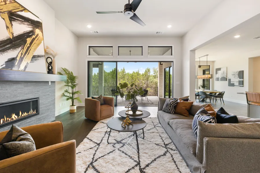 Sprawling 1 level home on secluded 1 acre lot with private, wooded backyard, and greenbelt views. Completed in May, 2023 this custom home is modern, open, and airy with clean lines, high ceilings, and design elements that complement the natural scenery surrounding the house. The layout offers 4 bedrooms, 4.5 bathrooms, a dedicated office, 2nd living/media room, covered outdoor living, an oversized laundry room, and 3 car garage. The attention to detail in finishes and function is amazing: the 4th bedroom has its own living area, and private entrance. Suitable for in-laws' quarters, housekeeper/nanny's suite, guest casita, or a 2nd office with separate entrance. The main living/dining areas feature wood floors and large, multi-panel sliding doors opening to outdoor living spaces with views of the heavily treed backyard. The dedicated office at the entry of the home also has wood floors and a wall of built-in floor to ceiling shelves. Gorgeous, well thought out kitchen with large island, wine rack, granite counter tops, and a large quartz farm sink. Upgraded appliances include a professional, propane cooktop with six burners and overhead warming lights. The butler's pantry is oversized, has an additional large sink, upper/lower cabinets, and shelves - plenty of space for food prep, small appliances, storage, or caterer’s station. The owners’ suite has wood flooring, a tray ceiling, and stunning views of the wooded backyard. The owners’ suite bathroom is breathtaking with the large carwash style, dual shower, free standing soaking tub, dual vanities – all designed with slate gray and marble-look high end tile. Located in Jonestown in The Hollows of Northshore, a master-planned community northwest of Austin resting on the North Shore of Lake Travis. Spanning over 1,400 acres of Hill Country and offering countless resort-style amenities, multiple pools, fitness center, sport courts, and miles of golf cart and hiking trails throughout the community.