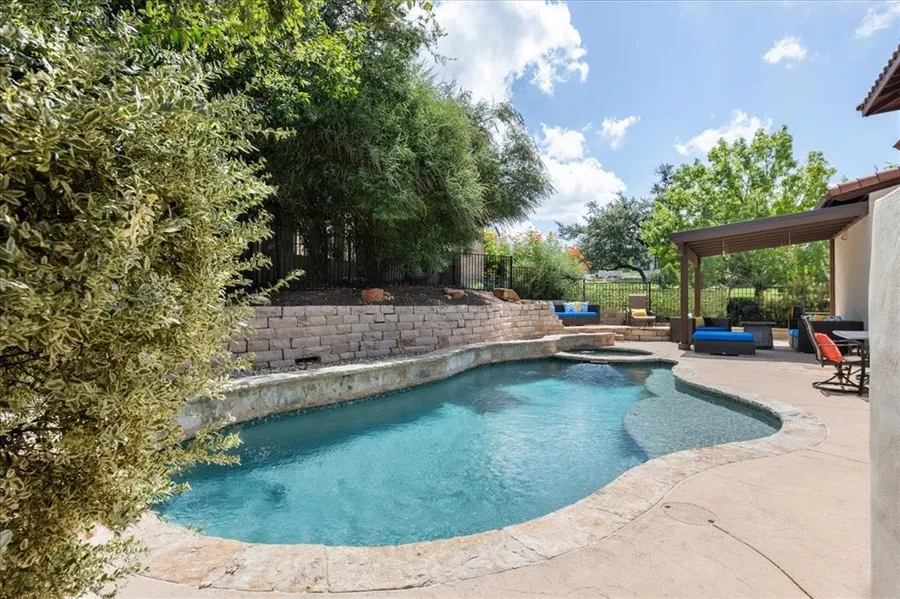 Exquisite Tuscan style Lock and Leave home in the highly desirable Grove neighborhood situated in the prestigious community of Falconhead.This is a ONE OF A KIND home boasts a PRIVATE SWIMMING POOL and HOT TUB surrounded by a large outdoor patio perfect for entertaining all year round. This 5 Bedroom, 4 Full Bathroom property features hardwood floors throughout the open concept living room and dining room floor plan. A spacious kitchen, featuring granite countertops, stainless steel appliances, a breakfast bar surrounded by windows that allow an abundance of natural light and views overlooking the incredible outdoor patio oasis. An office area is nestled off the living room and a spacious laundry room with easy access to the 2 car garage. On the main floor is the primary suite featuring an en-suite luxury bath with granite counter tops, dual vanities, walk-in shower, luxurious soaking tub and two expansive walk-in closets. Also on the main floor is a guest suite with a full bathroom. Upstairs you will find a media/flex room and a secondary bedroom with an ensuite bath and two additional secondary bedrooms sharing full bathroom both with large closets. The Backyard Oasis is made for entertainment, featuring an extended flagstone patio and ONE OF A KIND PRIVATE SWIMMING POOL AND HOT TUB 1 ADDITIONAL DEEDED PARKING SPOT.. The neighborhood offers a beautiful PGA Falconhead Golf course, a private park, hike and bike trails and it's just a short drive from the Hill Country Galleria shopping, restaurants, fitness facilities, several golf courses and boating on Lake Travis! Conveniently located in the award winning Lake Travis School District. The $170/monthly HOA covers lawn maintenance and upkeep of common areas; community pool, dog park and playground. The $125 quarterly covers security cameras in the neighborhood and common ground maintenance.