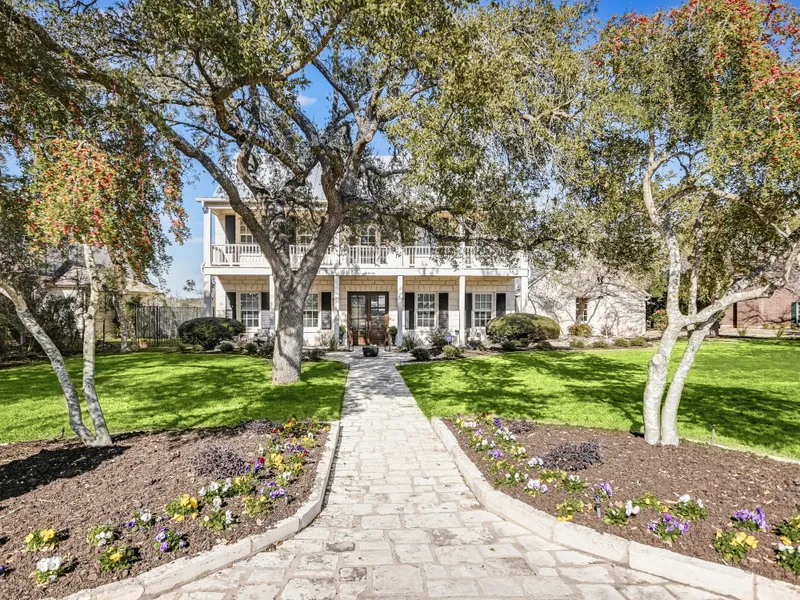 Enter the signature Lone Star entry to a classic center hall style - a Living Room on the right and a sophisticated office or library with wall-to-wall built-ins on your left. Quickly see that one of the best features of this incredible house is there are nothing but options here as the study could double for a first-floor primary bedroom and bath. Fabulous balconies front and back are running the length of the property, reminiscent of a great New Orleans manse. Abundant windows flood each room with light. There is a sitting room for reading and casual conversation, a traditional and generously sized dining room, and a stone-walled, perfectly appointed kitchen designed for entertaining. The adjoining great room is just begging for game days or marathon movie nights! More built-ins, stone trim, a hearth, and fireplace make this space literal perfection. And the views? The parklike setting front and back is nature at its best. The huge pool with natural stone walkways and surrounds, and views of a live oak valley beckon you to explore. And to complete the experience? The second-floor Primary Suite is so very spacious, and its indescribably stunning bath is quite simply the great escape!